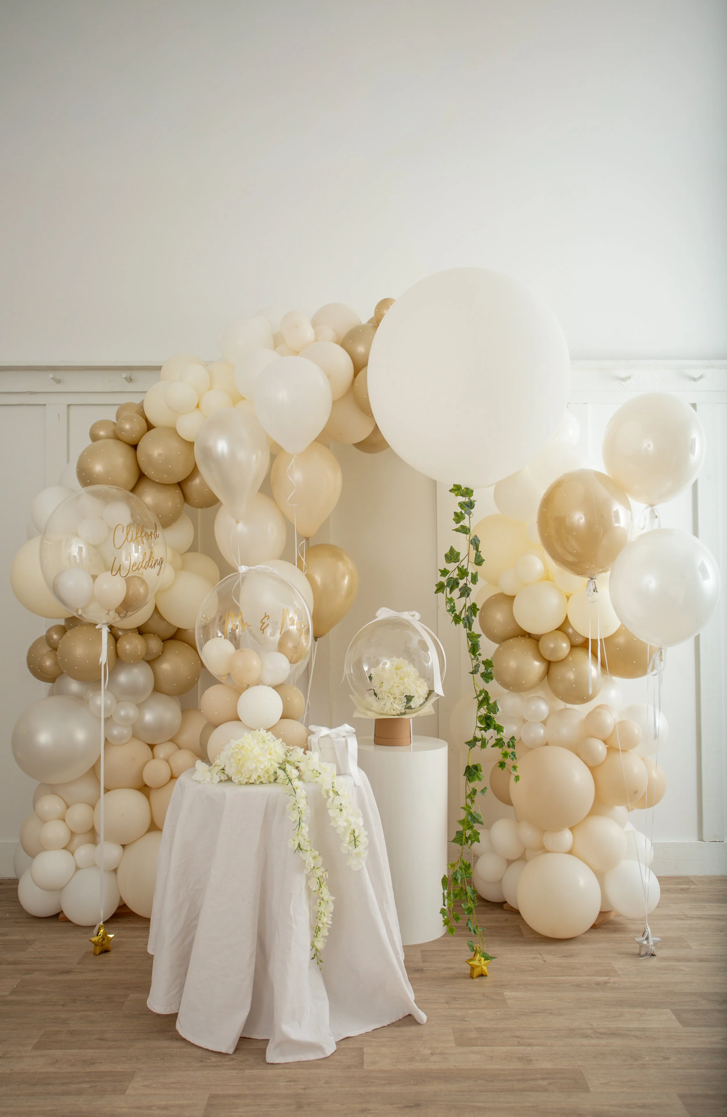Balloon décor has entered a new era. Think organic shapes, layered textures, and sophisticated color palettes like champagne, ivory, blush, and metallic gold.